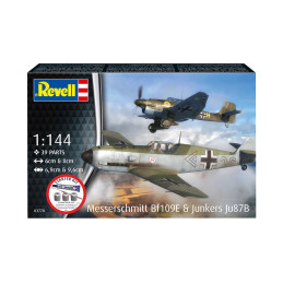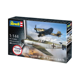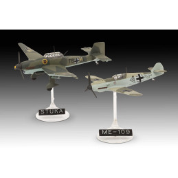 Messerschmitt Bf109E byl jedním z nejvýkonnějších stíhacích letounů své doby a stal se oporou německé Luftwaffe v počáteční fázi druhé světové války. Svou obratnost a palebnou sílu prokázal zejména v bitvě o Británii. Zde vyobrazenou variantu E-4 pilotoval major Erich Mix v květnu 1940 ve Francii. Junkers Ju87B Stuka je symbolem takzvané "bleskové války" - obávaný pro svou přesnost při střemhlavém bombardování a charakteristický kvílivý zvuk při střemhlavém letu. Model v sadě představuje verzi, která byla použita nad Libyí v roce 1941 - kus letecké historie, který nyní můžete oživit vlastníma rukama.